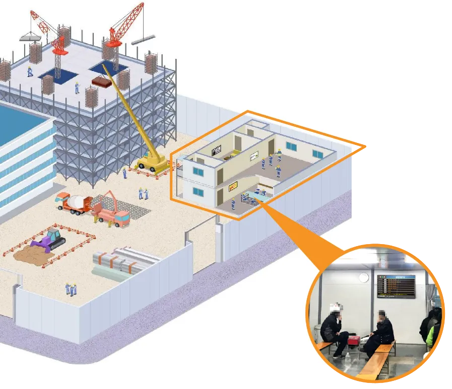 工事現場内の屋内休憩所(通称:詰所)に設置されているデジタルサイネージを活用して、現場で働く職人さんに向けて動画広告を配信いただけます。
