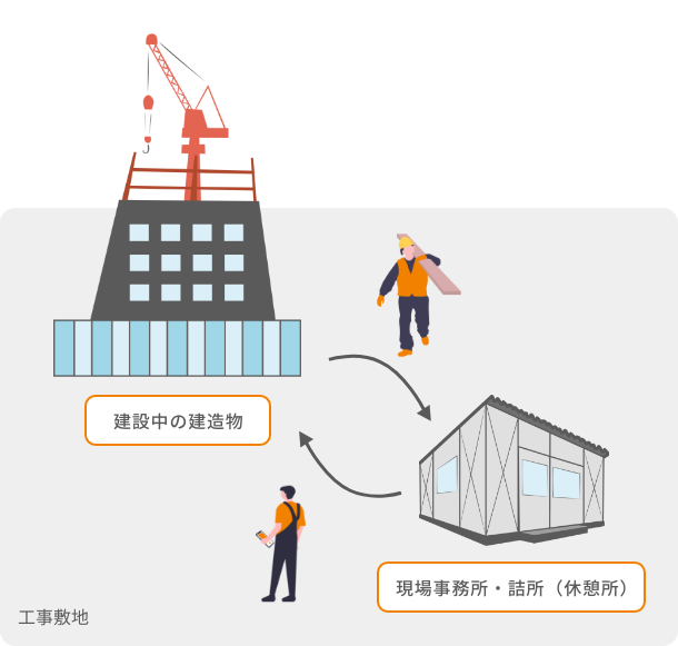 建設現場では、工事敷地内に仮設で現場事務所 や、 休憩所(通称:詰所)を設置します。ここは建設現場で働く人々の拠点となる場所であり、休憩や昼食、ミーティングなどで 1 日に何度も訪れる場所です。