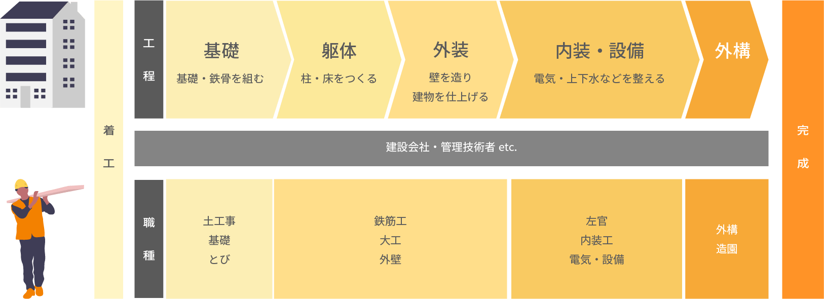 完成するまでの間に、工事工程に合わせてさまざまな職種の職人さんが出入りします。