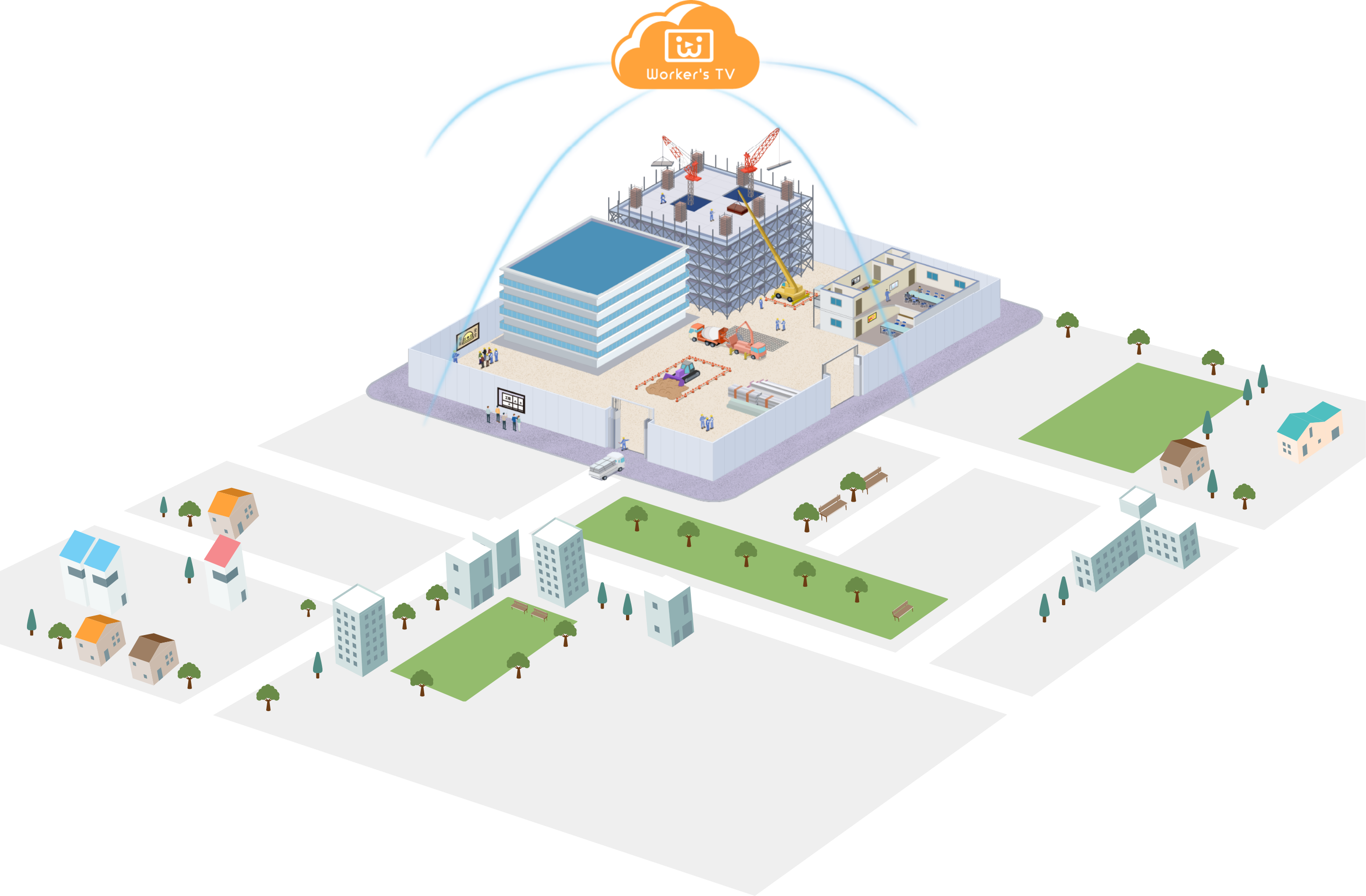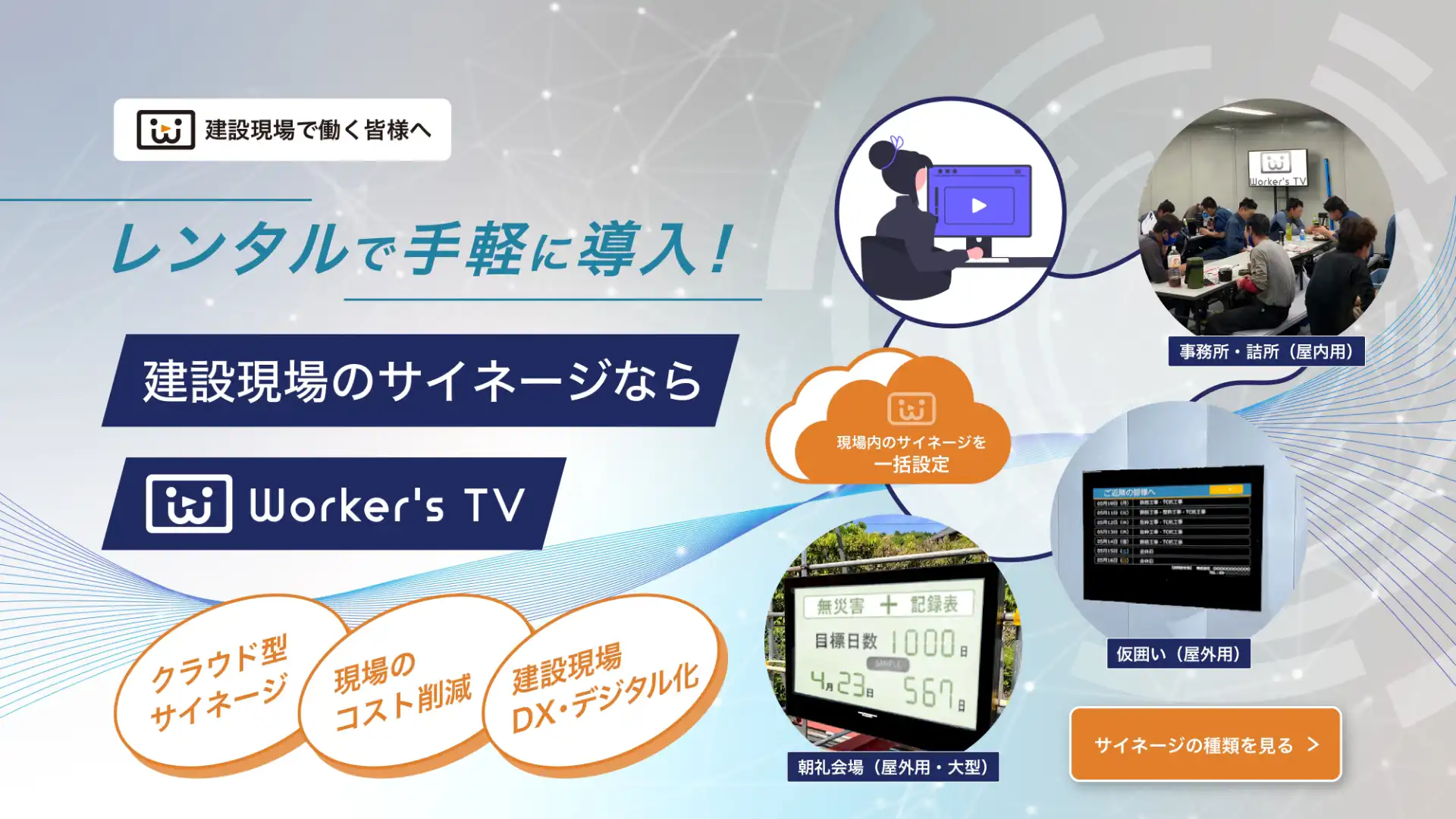 Workerʼs TVは「建設現場をもっと働きやすい場所にするために」をメインコンセプトとしたサイネージプラットフォームです。「使いやすさ」を追求した配信システムと、現場が抱える課題解決のためのソリューションサービスを提供していくことにより、ユーザーの皆様と共にこれからも「進化」を続けるサイネージサービスを⽬指していきます。