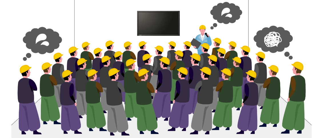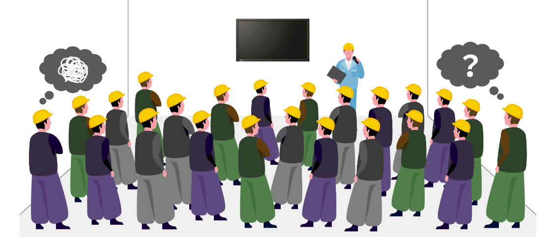 広い会場に大人数が集まる集合型朝礼の場合は、映像&音響機器を追加することにより、参加する職人の 「資料が見えない」 「声がよく聞こえない」といった情報伝達や、周知徹底をする上での課題点の解消を図ります。