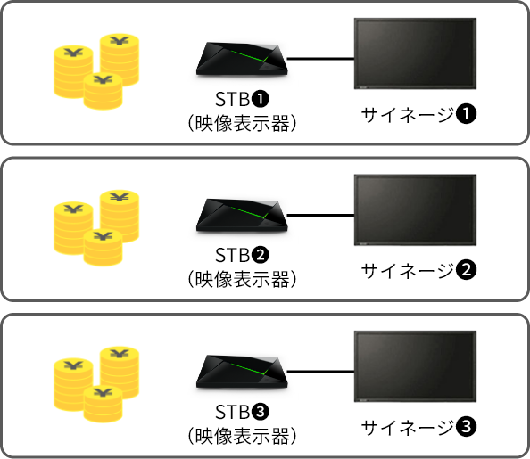 通常の設置方法だとサイネージとSTBが同数必要となるので、同じコンテンツを配信する場合は、ランニングコストがかさんでしまいます。