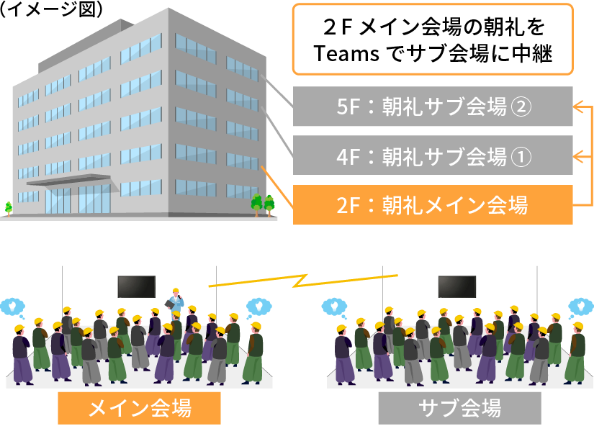 全職人が物理的に収容しきれない場合は「分散朝礼」で実施する必要があります。そこで、ZoomやTeamsといったWeb会議サービスと、映像分配設備を実装して、メイン会場の朝礼をサブ会場にライブ配信できるようにして、異なる場所で朝礼を受けられる環境を構築します。