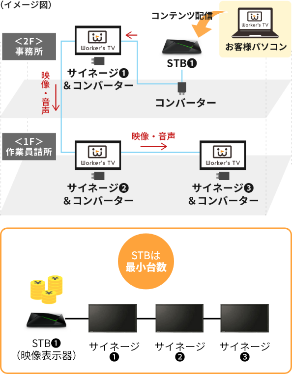 コンバーターと同軸ケーブルを使って、各サイネージを有線配線で繋ぐことで、STBは最小台数で複数サイネージに同じコンテンツを一斉配信することができますので、ランニングコストの削減効果が期待できます。